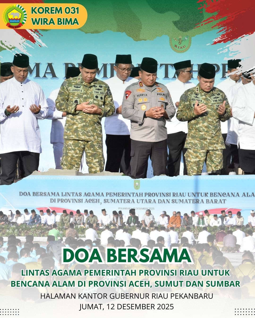 PEKANBARU || Komandan Korem 031/Wira Bima Brigjen TNI Jarot Suprihanto menghadiri Doa Bersama Lintas Agama yang digelar Pemerintah Provinsi Riau untuk korban bencana alam di Aceh, Sumatera Utara, dan Sumatera Barat. Kegiatan berlangsung di Halaman Kantor Gubernur Riau, Pekanbaru, Jumat (12/12/2025).